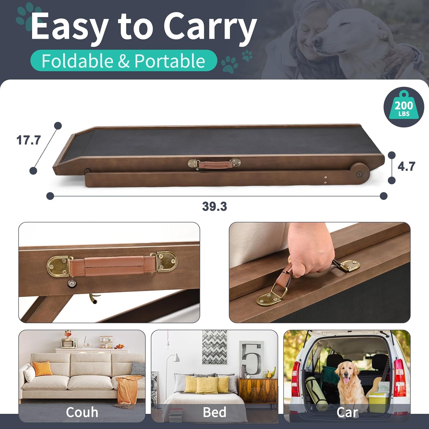 - STURDY & DURABLE: Our dog ramp for dogs and cats is specially made very well - solid wood construction and sturdy stainless steel fasteners, which has been tested to support up to 200lbs. When they jump off the bed, sofa, and sofa, there is no need to worry about getting injured, which provides safety for your pet.