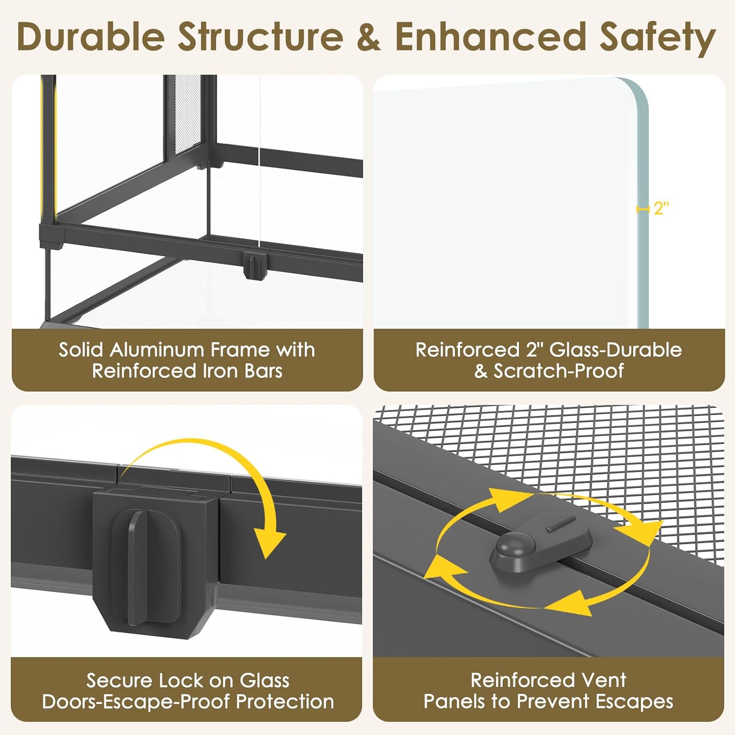 - Solid and Stable Structure: This bearded dragon tank crafted with a pure aluminum frame, built-in iron bars, and 2" thick tempered glass for a sturdy, impact-resistant, and scratch-proof tortoise habitat